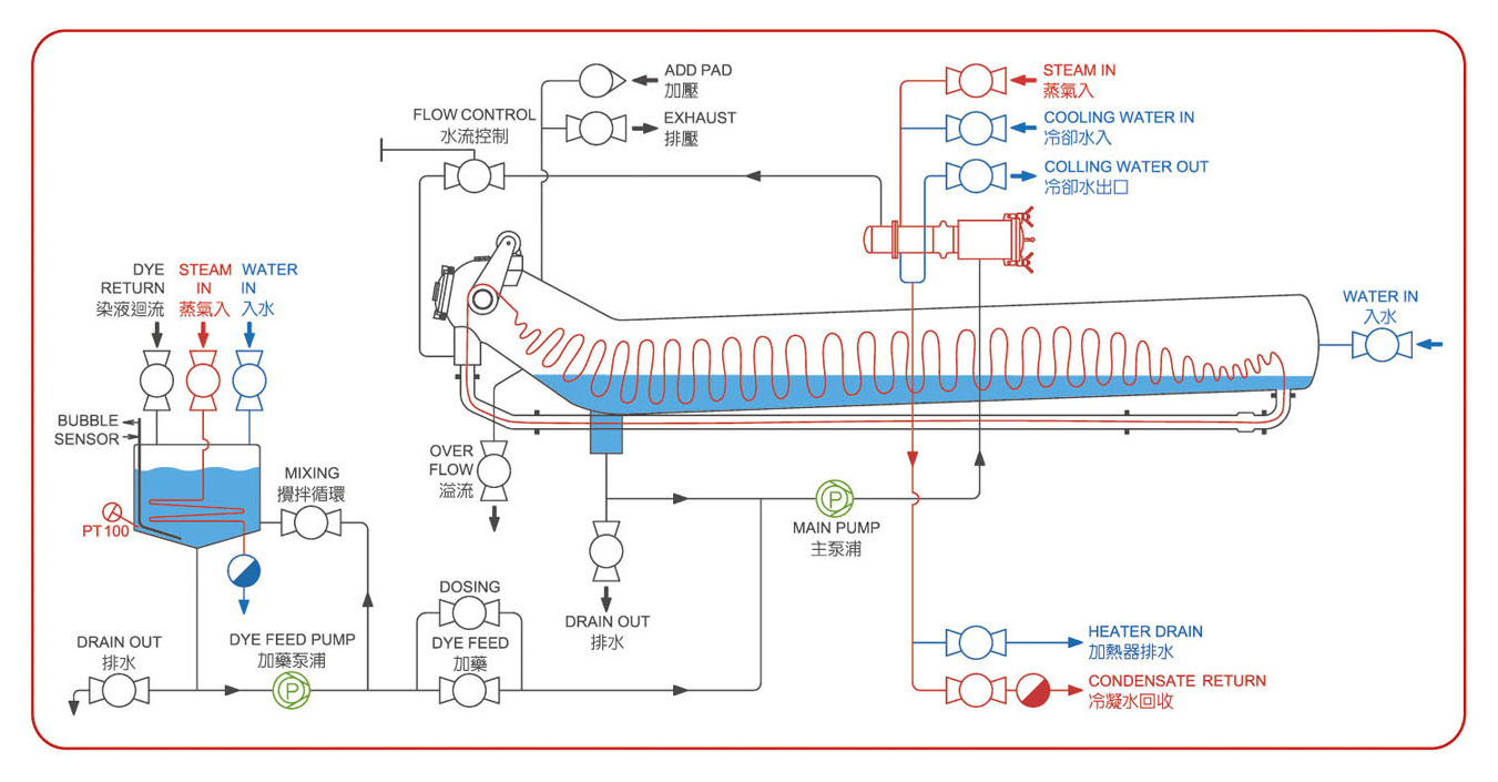 The machine is fully automatic controlled with advanced computer system. Design to have a precise dye feeding control, greatly enhance the dyeing success ratio and quality of dyeing. In conjunction with the central control system will provide better production system and management.